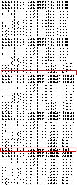 分类结果使用printf输出到串口,以下为运行效果;可看出,60组测试集,有2组分类错误,58组正确,准确率为96.7%。准确率与训练集、测试集的选取有关。训练集和测试集可增删、修改、互换。