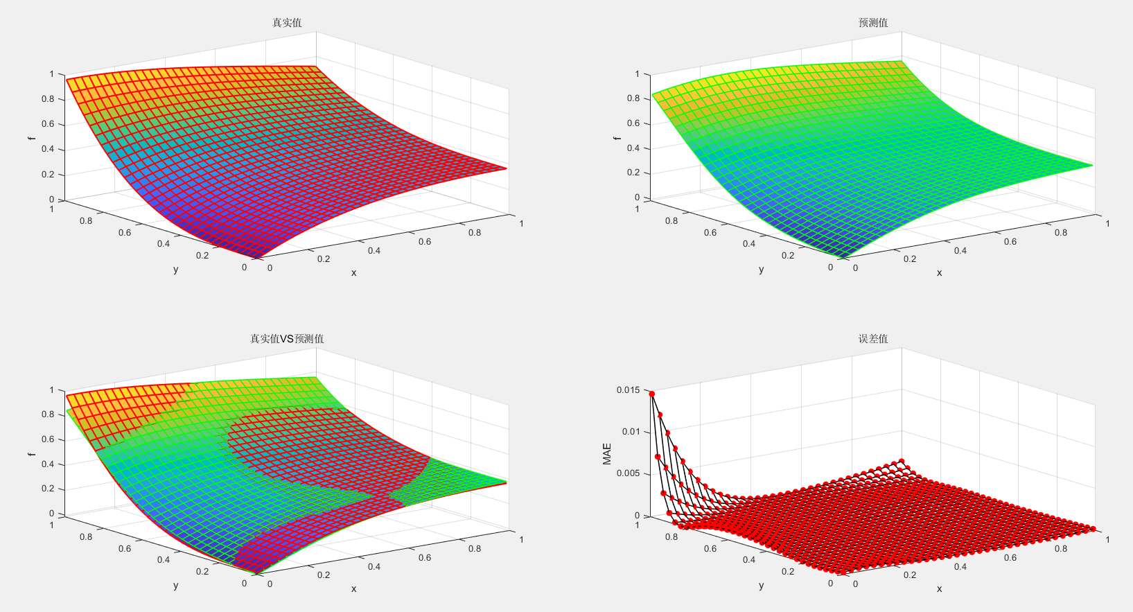 可以看出SSA优化BP神经网络用于求解偏微分方程十分有效,真实值和预测值非常接近,效果显著。