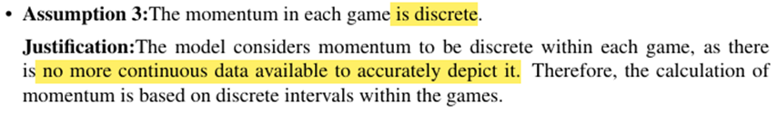 好的假设是数学化的陈述+合理的解释,例如队伍2418251提出每局比赛中的势头是离散的。