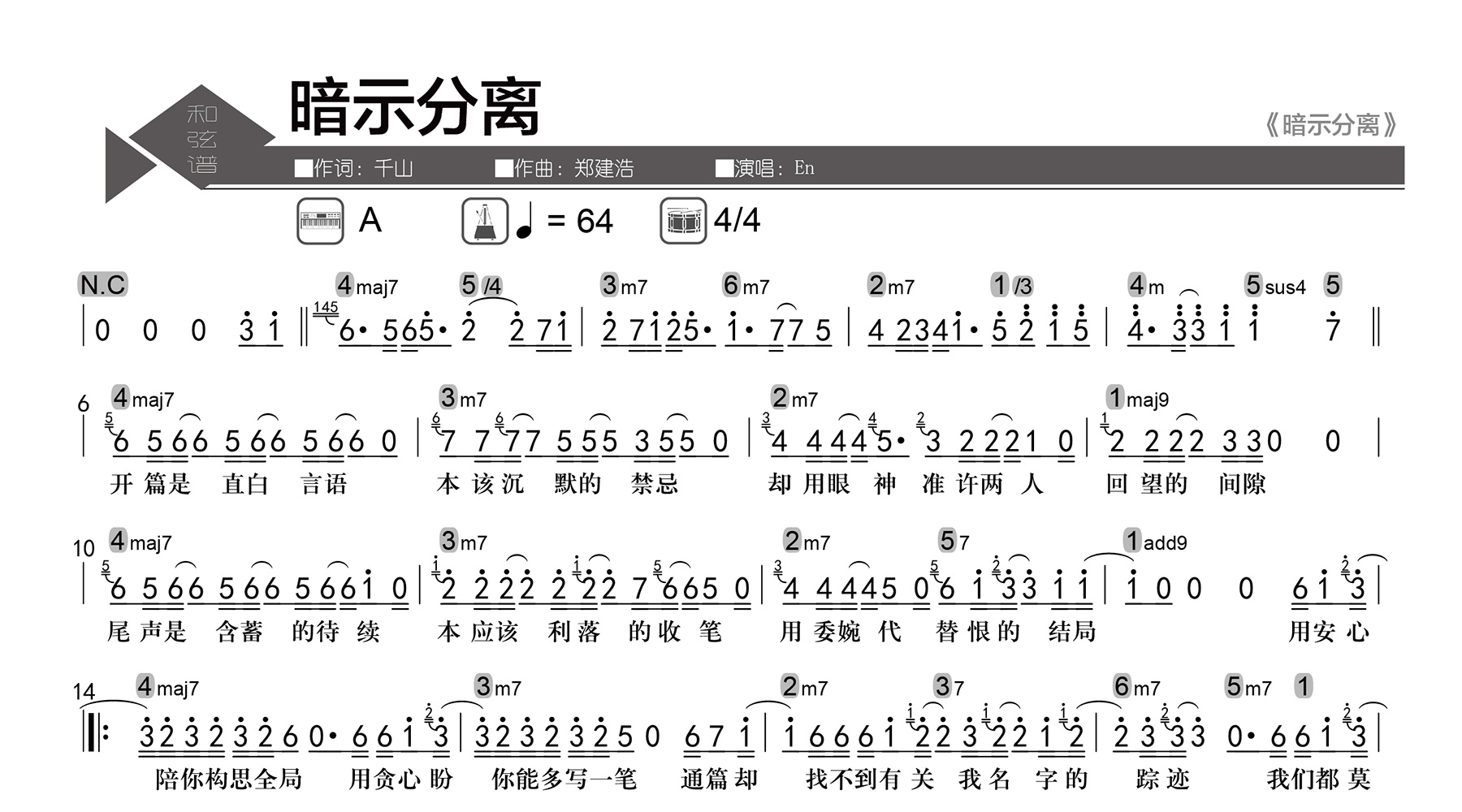 【歌曲信息】Key:A Tempo:4/4 每分钟64拍。