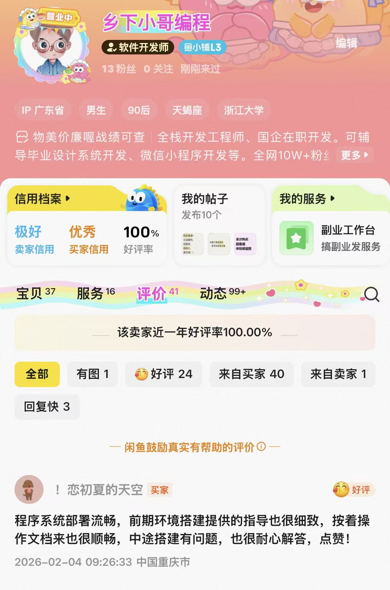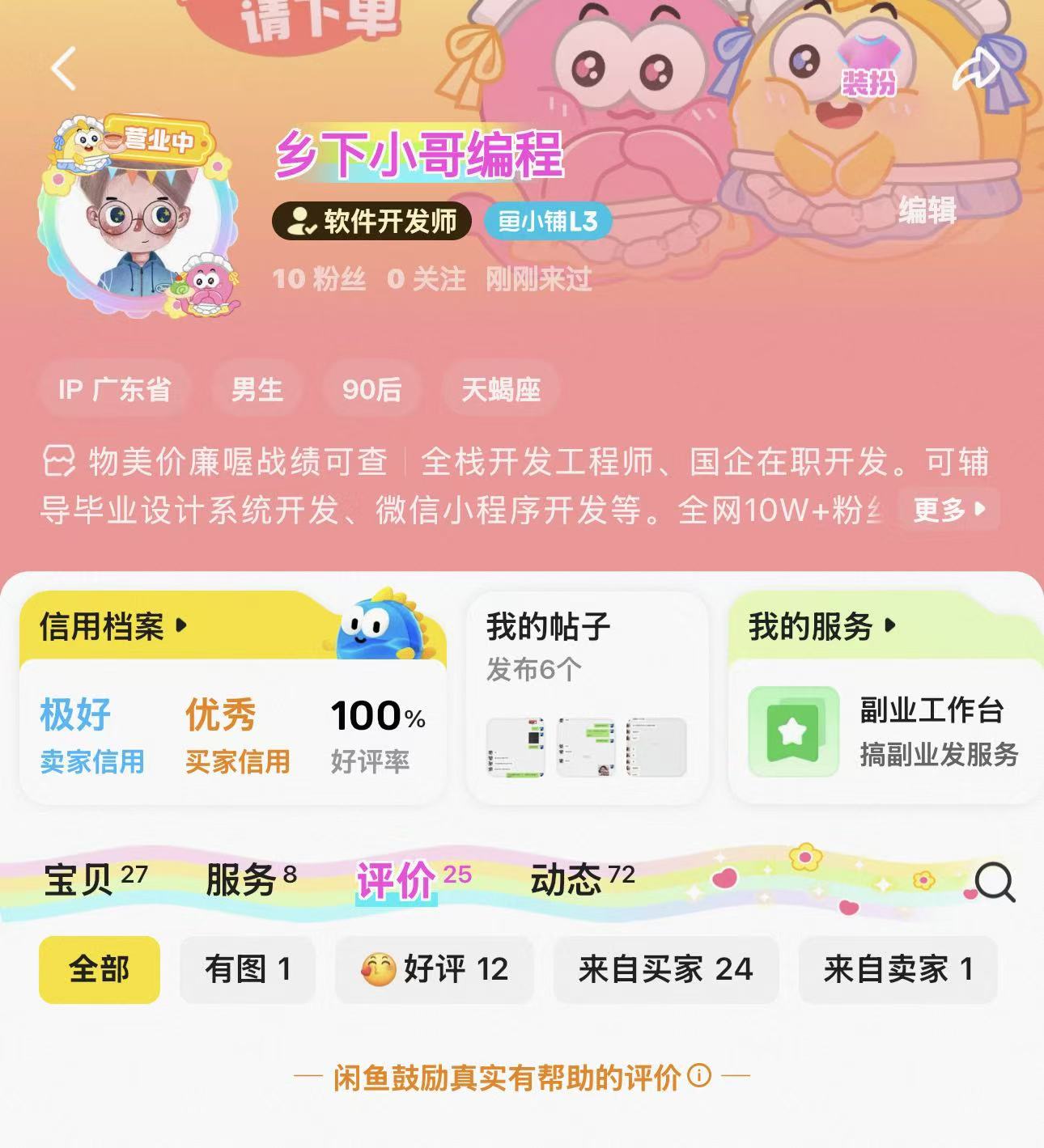 咸鱼平台:软件开发工程师官方认证。好评率100%、零差评~