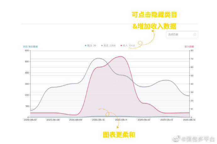 每位创作者肯定都非常关心自己作品的浏览、出售情况!面包多特意提供了数据页面,你可以在这里清楚地看到每天的浏览、出售情况;购买者来源的渠道~