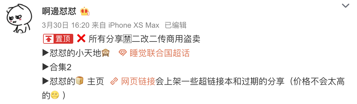 可以告诉粉丝 “我的🍞店铺xxxxx(假装是个人店铺的链接)。所有的作品都在这里,之后更新的也会放进去。大家可以更方便地获得啦 ~” 并把这一条微博置顶
