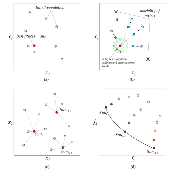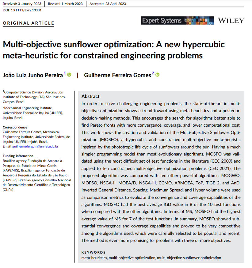 Pereira, João Luiz Junho and Guilherme Ferreira Gomes. “Multi‐objective sunflower optimization: A new hypercubic meta‐heuristic for constrained engineering problems.” Expert Systems 40 (2023)