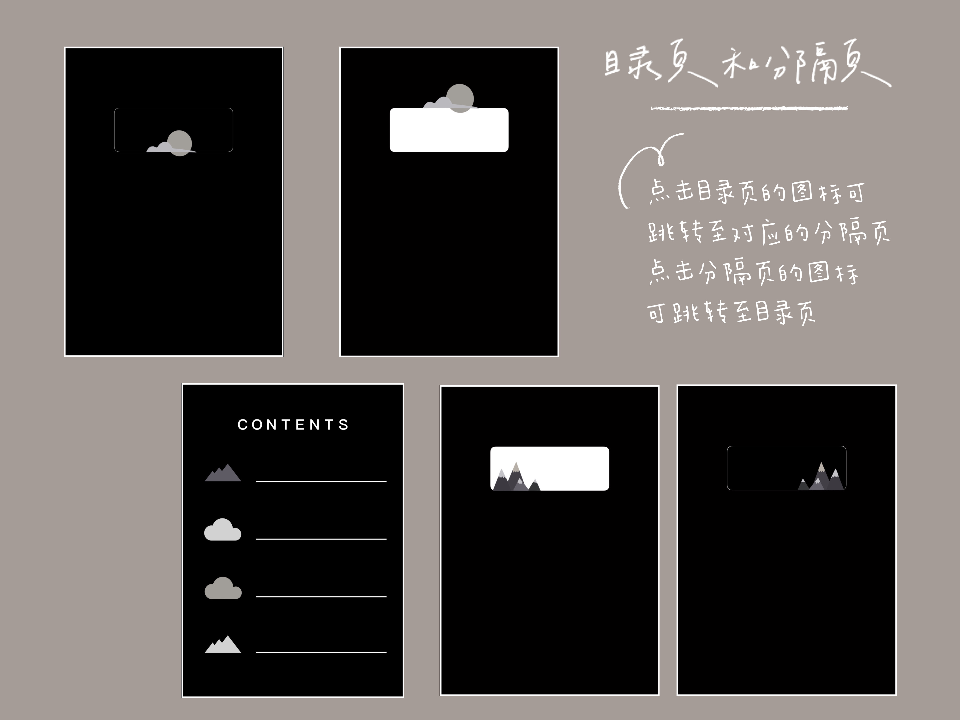 2.主要是暗色系的本子,目录页和分隔页互相跳转,点击每页内页的小图标跳转至对应的分隔页。