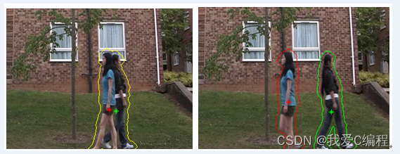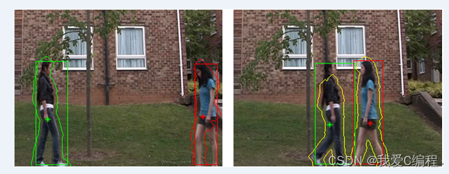 第四:物体的分割,采用传统的方框来分,人物轮廓的分割方法在交叉的时候,或者是物体在较远的时候,不太可行。