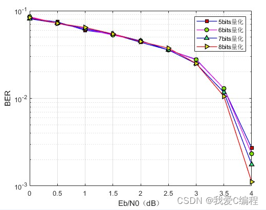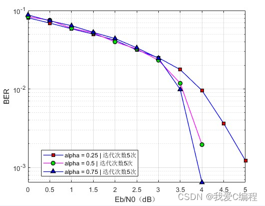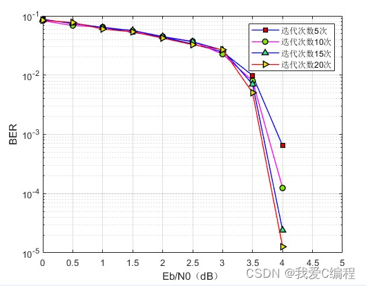 6.采用归一化最小和译码算法在不同迭代次数的仿真程序以及对比图,作为选择最大迭代次数的依据(matlab)