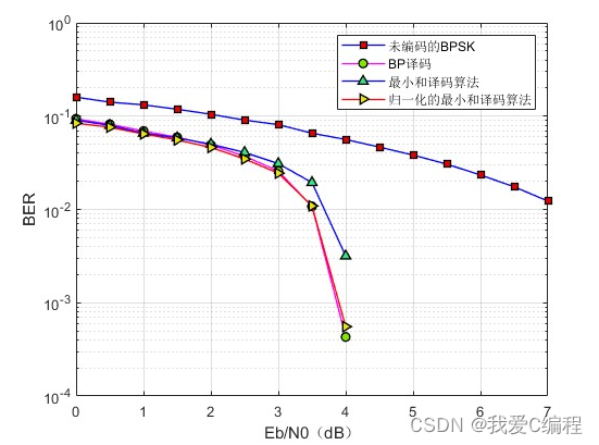 4.BP译码算法,最小和译码算法(MSA),归一化的最小和译码算法以及未经编码的采用BPSK调制。这几种译码算法的误码率对比程序及误码率曲线对比图。