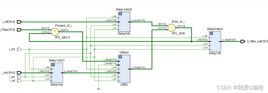 LMS参考设计包括两个主要的功能模块 - 一个FIR滤波器和LMS算法。使用一个乘法器和一个具有反馈的加法器串行实现FIR滤波器。 FIR结果归一化,以尽量减少饱和。 LMS算法迭代更新系数,并把其馈送到FIR滤波器。FIR滤波器使用系数c(n)和输入的参考信号x(n)生成输出y(n)。然后所希望的信号d(n)与输出y(n)相减,产生一个误差,LMS算法用它来计算下一组的系数。
