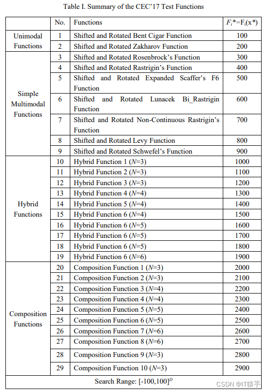 CEC2017共有30个无约束测试函数分别是:单峰函数(F1-F3)、简单多峰函数(F4-F10)、混合函数(F11-F20)和组合函数(F21-F30)。测试维度包含:10D、30D、50D、100D。CEC2017无约束测试问题随着维度的增加求解极其困难。