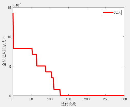 斑马优化算法以5个无人机的待优化路径为决策向量,无人机集群的总成本为适应度函数值,设置种群大小为200,最大迭代次数为300。