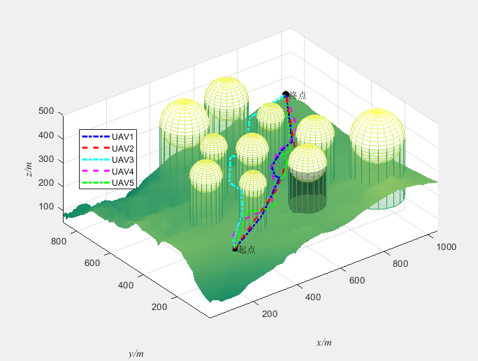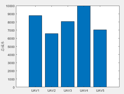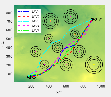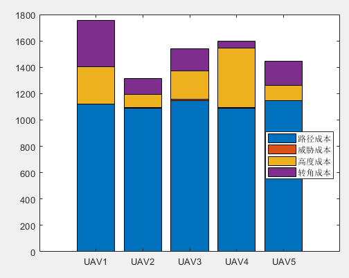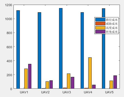 本文中以5个无人机构成无人机集群,采用斑马优化算法同时规划五个无人机的路径,每个无人机的总成本由路径成本、威胁成本、高度成本和转角成本四个部分构成。无人机集群的总成本为5个无人机成本之和。