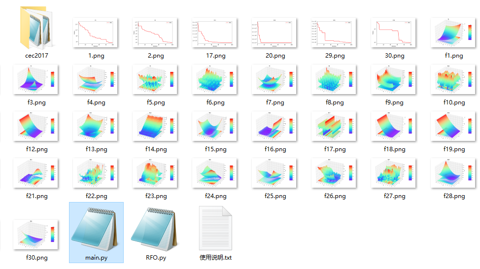 文件夹内包含RFO求解cec2017完整python代码,点击main.py即可运行。
