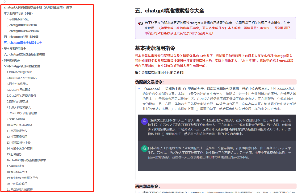 《chatgpt无障碍使用珍藏手册》是本人呕心沥血制作,原创近9万字!无论您是高端的技术人员或者很了解chatgpt,亦或是刚接触chatgpt的小白,这本手册可能都很适合您!手册用的是字节跳动官方旗下的“飞书”在线文档建立的,所以大家请把心放到肚子里,资料保证真实有效,而且毫无夸大成分。整体目录详情如下: