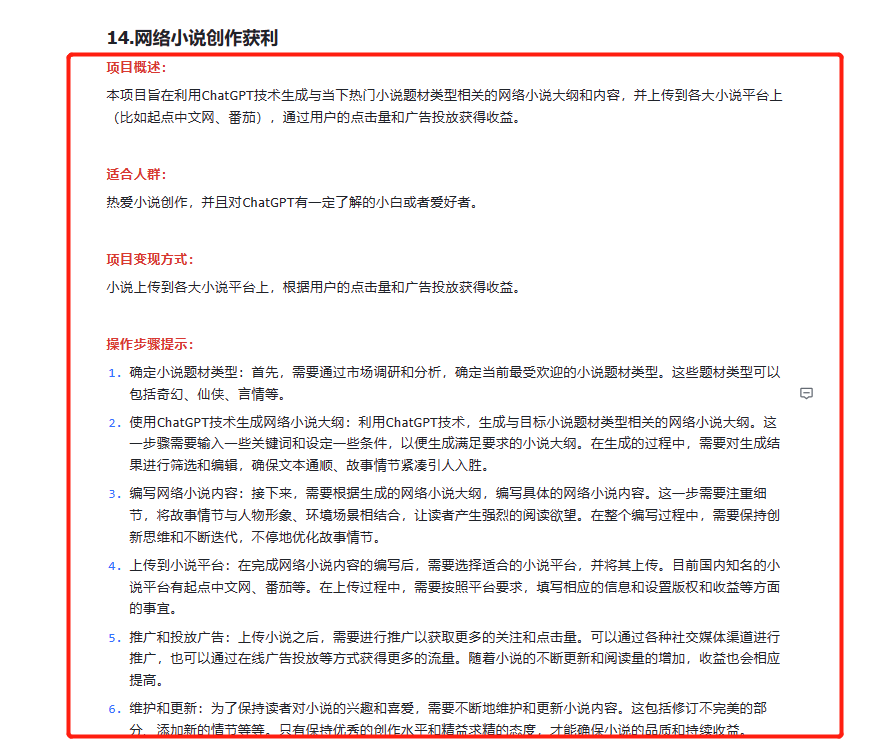 这里我将28个变现和创业项目中的第十四个项目《网络小说创作获利》拿出来做完整的展示(其余项目也是一样按照这个类型撰写的)