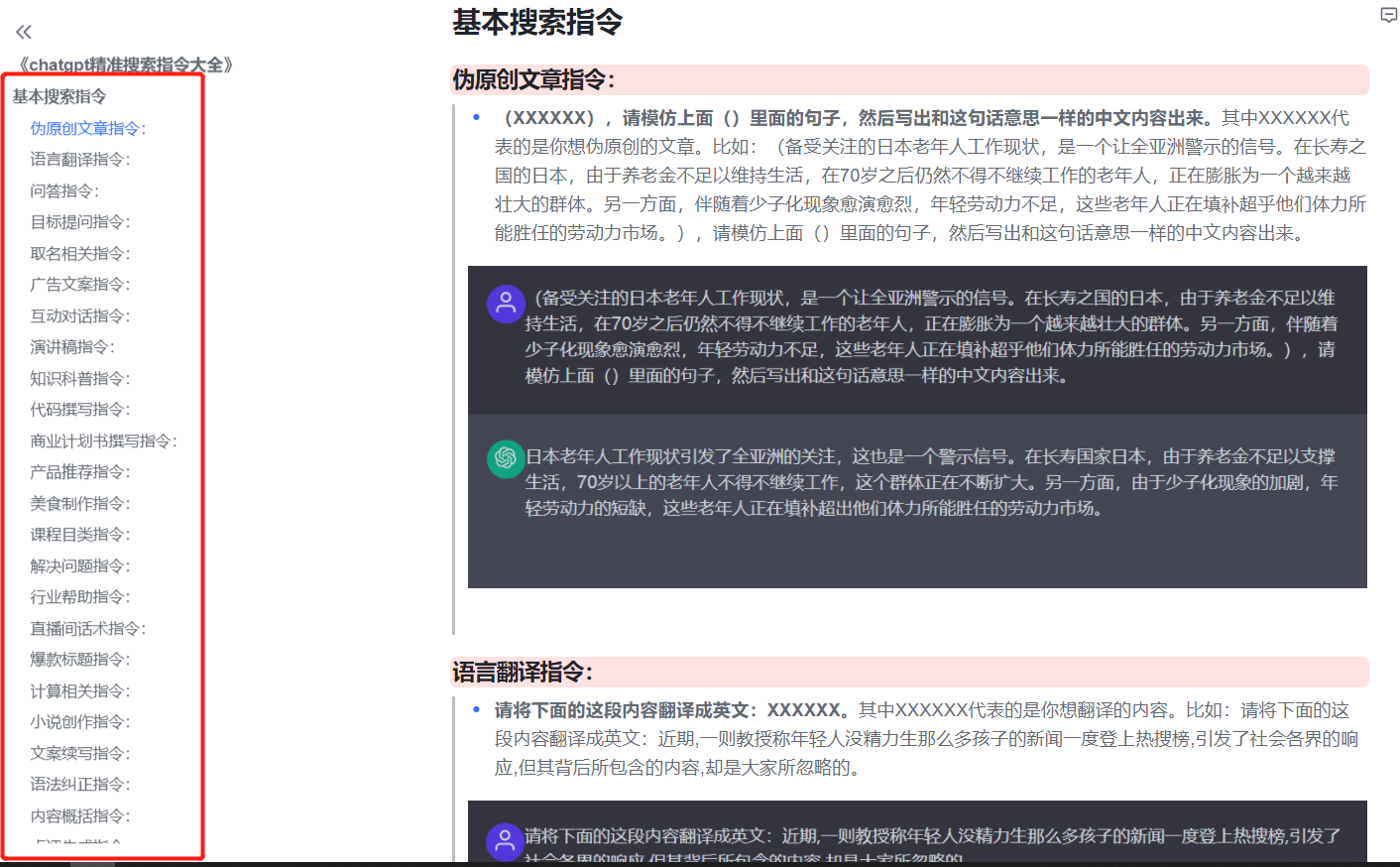 为了让更多的朋友能更好的通过chatgpt来获得自己想要的答案,这里原创了相关的搜索指令,供大家免费使用。同时,还将不定期的对搜索指令进行增加和完善。
