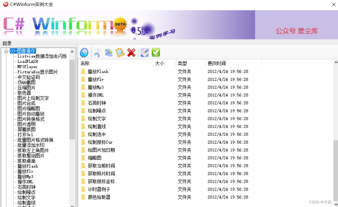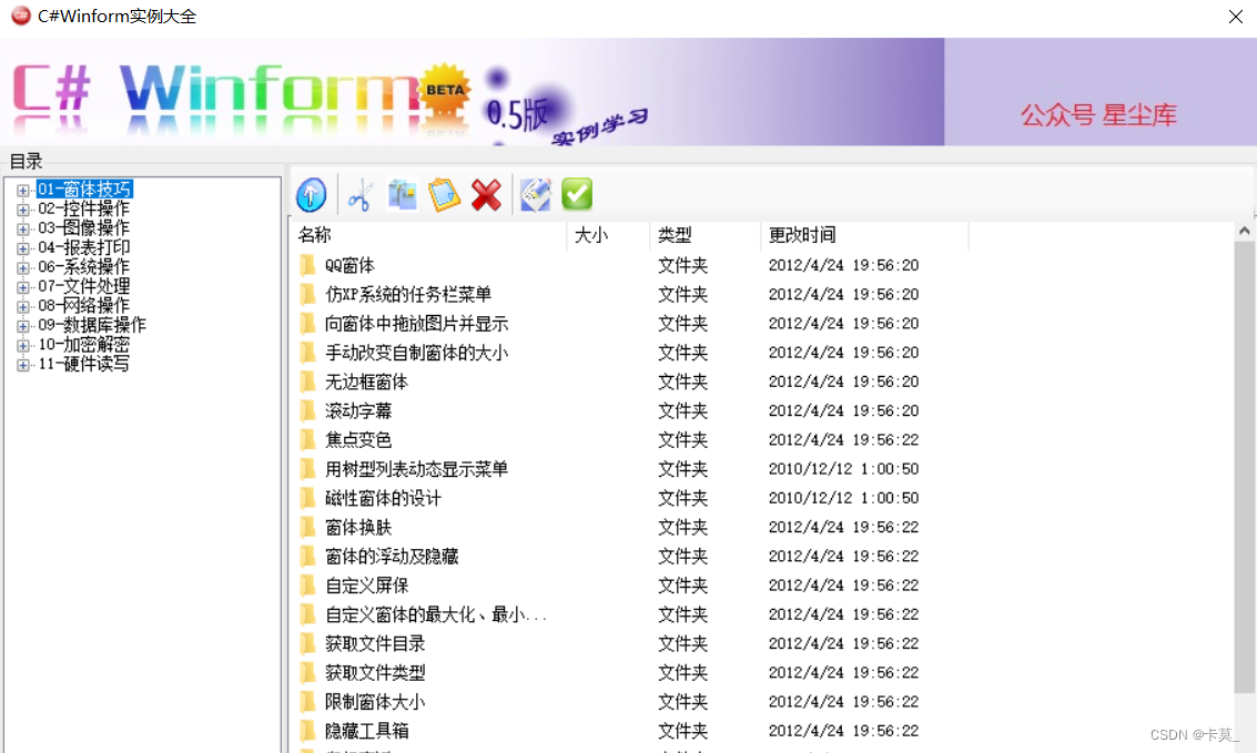 198个经典C#WinForm实例源码 1、窗体 2、控件 3、图像 4、报表 5、系统 6、文件 7、网络 8、数据库 9、加密、解密 10、硬件读写