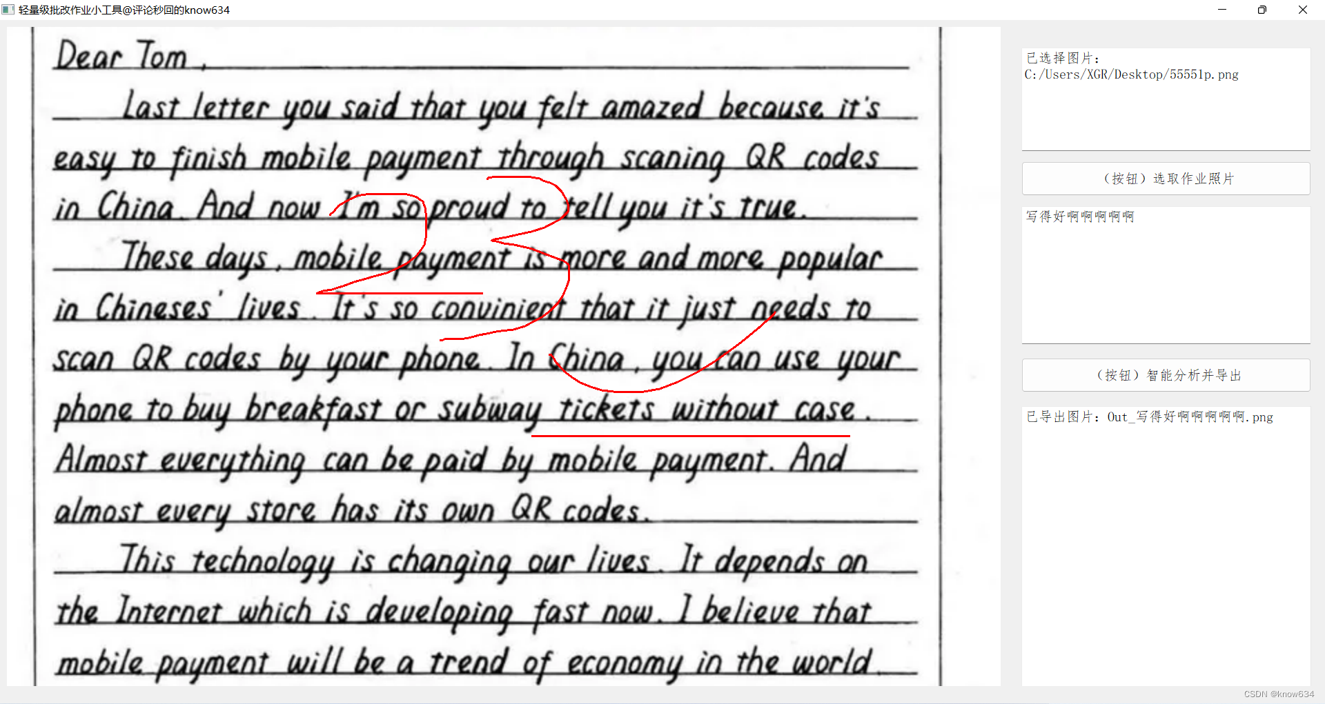 这是一款名为“定制软件开发,轻量级批改作业小工具”的应用程序,它是利用 Python 语言和 PyQt 框架开发的。如果你是一位教师,经常需要批改学生的作业,那么这款工具或许可以帮助你。