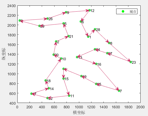 算法得到的路径:1 > 28 > 8 > 23 > 27 > 24 > 13 > 16 > 7 > 25 > 19 > 4 > 15 > 11 > 22 > 17 > 14 > 18 > 10 > 20 > 2 > 21 > 5 > 29 > 3 > 26 > 9 > 12 > 6 > 1