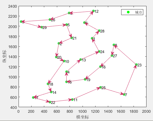 算法得到的路径:1 > 28 > 6 > 12 > 9 > 26 > 3 > 29 > 5 > 21 > 2 > 20 > 10 > 18 > 14 > 17 > 22 > 11 > 25 > 7 > 23 > 8 > 27 > 16 > 19 > 15 > 4 > 13 > 24 > 1