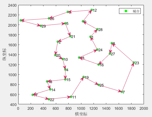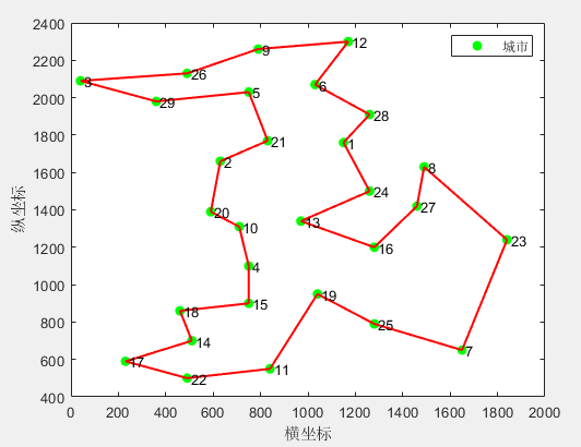 算法得到的路径:1 > 28 > 6 > 12 > 9 > 26 > 3 > 29 > 5 > 21 > 2 > 20 > 10 > 4 > 15 > 18 > 14 > 17 > 22 > 11 > 19 > 25 > 7 > 23 > 8 > 27 > 16 > 13 > 24 > 1