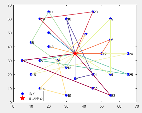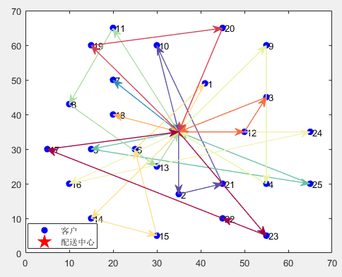 配送路线3:0->5->25->0 服务顾客数量:2 路径长度:105.14674 装载量:32