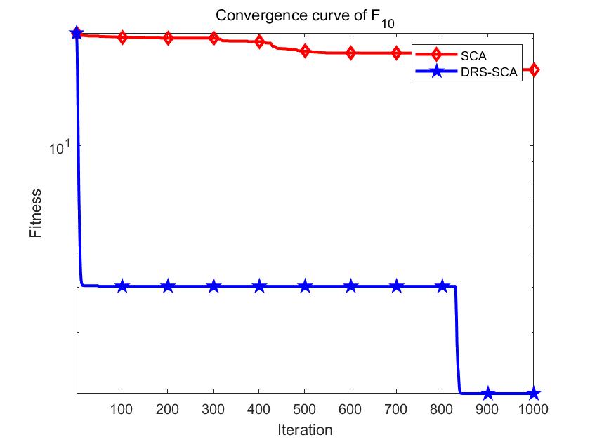 在每次调用动态局部搜索算子后应对搜索后的结果进行边界控制,以保证其处在搜索域内。之后借助贪婪选择,如果得到的结果比当前最优解好,则更新之;否则,保持当前最优解不变。如下图所示,以基于动态随机搜索的正余弦算法(A sine cosine algorithm based on dynamic random search, DRS-SCA)为例