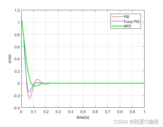 PID控制器,其超调较大,且控制器进入收敛状态时间也最长,。对于模糊PID控制器,其超调小于PID控制器,且收敛速度也较快,因此其性能优于传统的PID控制器。对于MPC控制器,其超调最小,控制器进入稳定状态速度也最快,因此其控制性能最优,但是MPC的上升时间较慢,大约需要0.1s左右完成。但在实际情况下,对控制对象起到影响的主要是控制器的超调和收敛稳定时间两个因素。因此,MPC控制器的控制效果最优,其次为模糊PID控制器,最次是PID控制器。
