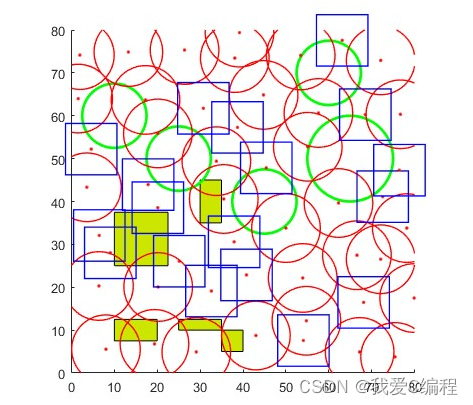 覆盖的计算,采用的是平面扫描法,对于两种传感器,一个圆形,一个正方形,那么对于每次优化得到的坐标,我们对整个平面区域进行扫描,计算每一个点是否处于某个或者多个传感器,如果满足这个条件,那么这个点计入到覆盖区域里面,然后扫描完所有点之后,统计一共多少个点呗扫描进去了,即覆盖率。