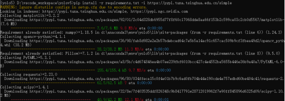 (2)利用Conda创建环境(Anacodna),conda create -n yolo5 python=3.8 然后安装torch和torchvision(pip install torch==1.10.0+cu113 torchvision==0.11.0+cu113 -f https://download.pytorch.org/whl/torch_stable.html -i https://pypi.tuna.tsinghua.edu.cn/simple)其中-i https://pypi.tuna.tsinghua.edu.cn/simple代表使用清华源,这行命令要求nvidia-smi显示的CUDA版本>=11.3,最后安装剩余依赖包使用:pip install -r requirements.txt -i https://pypi.tuna.tsinghua.edu.cn/simple