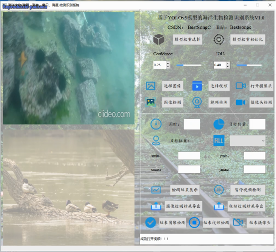 再点击视频检测按钮可完成输入视频的目标检测功能,之后系统会在用时一栏输出检测用时,在目标数量一栏输出已检测到的目标数量,在下拉框可选择已检测目标,对应于目标位置(即xmin、ymin、xmax以及ymax)标签值的改变。