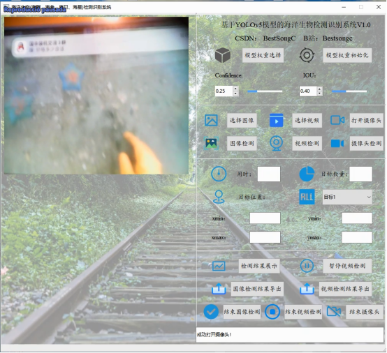 再点击摄像头检测按钮可完成输入摄像头的目标检测功能,之后系统会在用时一栏输出检测用时,在目标数量一栏输出已检测到的目标数量,在下拉框可选择已检测目标,对应于目标位置(即xmin、ymin、xmax以及ymax)标签值的改变。