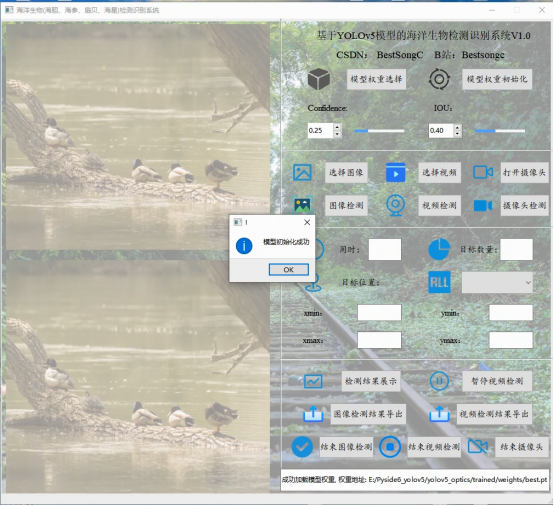 用户可以点击模型权重选择按钮上传训练好的模型权重,训练权重格式可为.pt、.onnx以及。engine等,之后再点击模型权重初始化按钮可实现已选择模型初始化信息的设置。