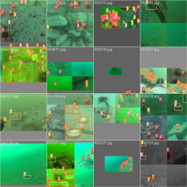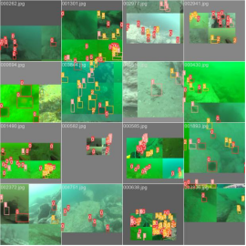 下图展示了本博文在使用YOLOv5模型对海洋生物数据集进行训练时候的Mosaic数据增强图像。
