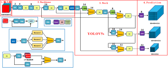 本系统采用了基于深度学习的单阶段目标检测算法YOLOv5,相比于YOLOv3和YOLOv4,YOLOv5在检测精度和速度上都有很大的提升。YOLOv5算法的核心思想是将目标检测问题转化为一个回归问题,通过直接预测物体中心点的坐标来代替Anchor框。此外,YOLOv5使用SPP(Spatial Pyramid Pooling)的特征提取方法,这种方法可以在不增加计算量的情况下,有效地提取多尺度特征,提高检测性能。YOLOv5s模型的整体结构如下图所示。