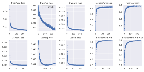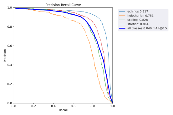 在实验结果与分析部分,我们使用精度和召回率等指标来评估模型的性能,还通过损失曲线和PR曲线来分析训练过程。在训练阶段,我们使用了前面介绍的海洋生物数据集进行训练,使用了YOLOv5算法对数据集训练,总计训练了300个epochs。在训练过程中,我们使用tensorboard记录了模型在训练集和验证集上的损失曲线。从下图可以看出,随着训练次数的增加,模型的训练损失和验证损失都逐渐降低,说明模型不断地学习到更加精准的特征。在训练结束后,我们使用模型在数据集的验证集上进行了评估,得到了以下结果。