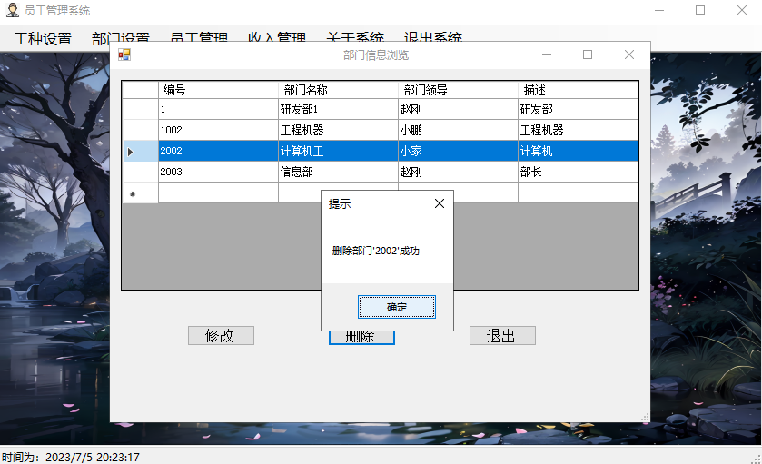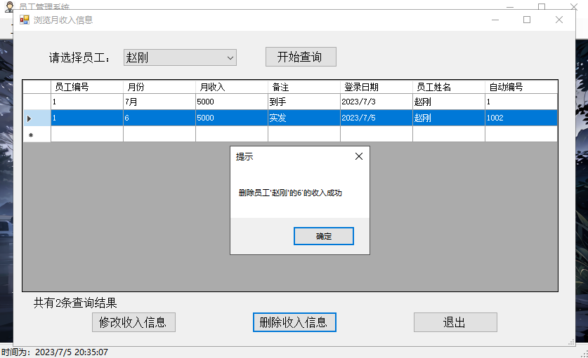 删除员工收入信息,并提示删除成功