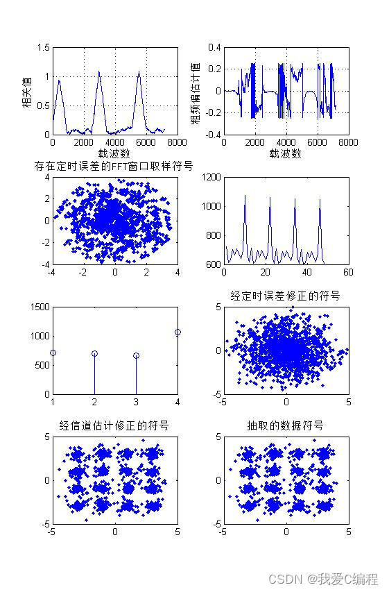 基于DVB-T的COFDM+16QAM+Viterbi码通信链路是一种常用的数字视频广播系统,用于实现高效的传输和接收。该系统结合了正交频分复用(COFDM)、16QAM调制和Viterbi编码与解码技术。此外,系统中还包括载波同步、定时同步和信道估计模块,用于实现信号的载波频率和定时偏移的同步,以及信道状态的估计。本文将详细介绍基于DVB-T的COFDM+16QAM+Viterbi码通信链路的系统原理、数学公式和各个环节的功能。基于DVB-T的COFDM+16QAM+Viterbi码通信链路通过COFDM技术将数据分成多个子载波,在频域上并行传输,提高了系统的抗多径衰落和频偏的能力。16QAM调制将每四个比特映射到一个复数点上,实现了16种相位和振幅的调制。Viterbi编码是一种误码控制编码技术,通过状态转移图构建编码器和解码器。载波同步、定时同步和信道估计模块用于实现信号的载波频率和定时偏移的同步,以及信道状态的估计。