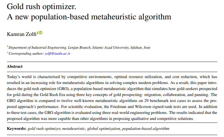 [1] K. Zolfi. Gold rush optimizer: A new population-based metaheuristic algorithm. Operations Research and Decisions 2023: 33(1), 113-150. DOI 10.37190/ord230108