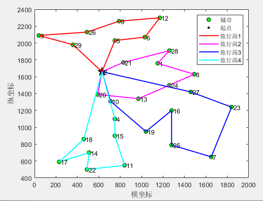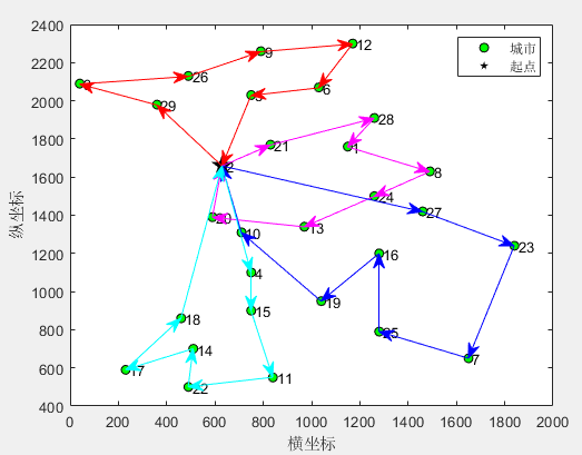 第1个旅行商的路径:2->29->3->26->9->12->6->5->2