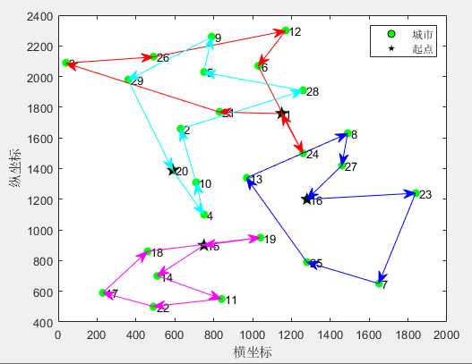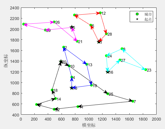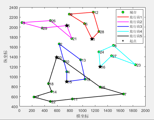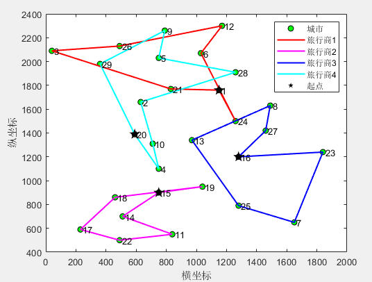 StartPoint=[1 5 15 16 20];%起点城市的序号(可以修改) 必须由小到大排列 (建议:2到6个旅行商)