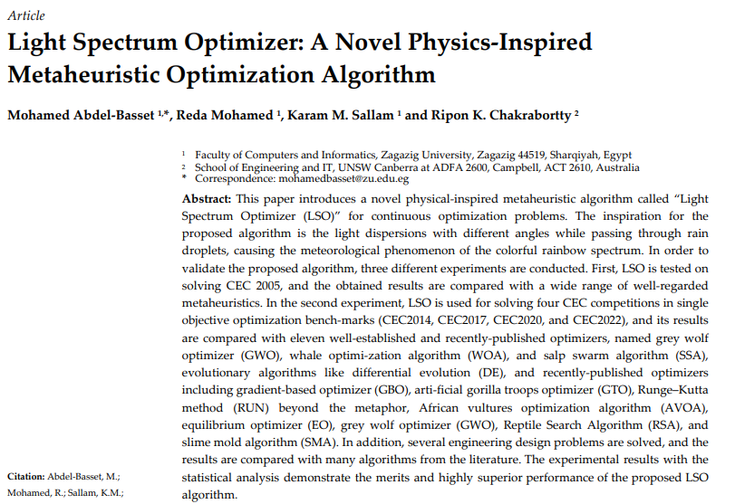 [1]Abdel-Basset M, Mohamed R, Sallam KM, Chakrabortty RK. Light Spectrum Optimizer: A Novel Physics-Inspired Metaheuristic Optimization Algorithm. Mathematics. 2022; 10(19):3466. https://doi.org/10.3390/math10193466