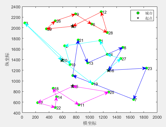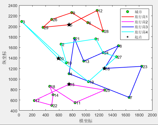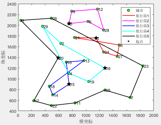 StartPoint=[1 5 15 16 20];%起点城市的序号(可以修改) 必须由小到大排列 (建议:2到6个旅行商)