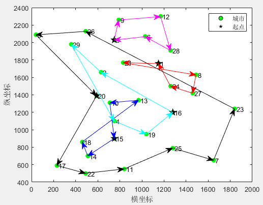 第1个旅行商的路径:5->29->26->9->6->28->12->5