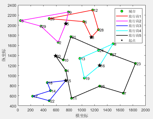 StartPoint=[1 5 15 16 20];%起点城市的序号(可以修改) 必须由小到大排列 (建议:2到6个旅行商)