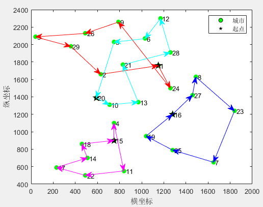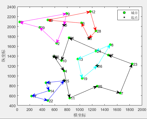 第1个旅行商的路径:1->24->9->26->3->29->2->1
