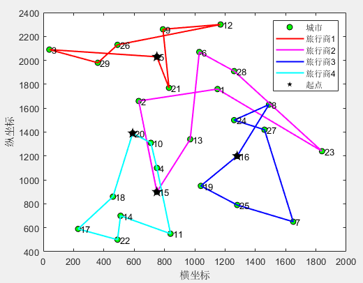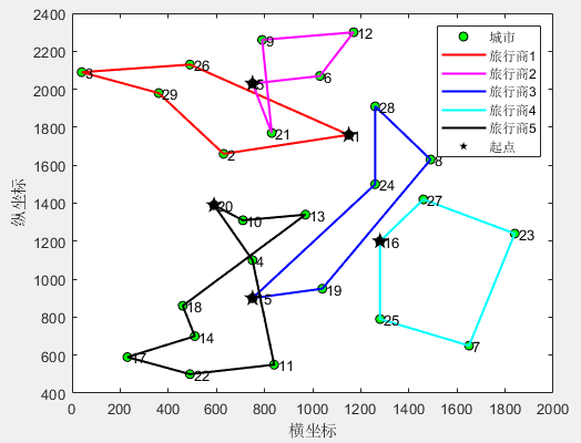 StartPoint=[1 5 15 16 20];%起点城市的序号(可以修改) 必须由小到大排列 (建议:2到6个旅行商)