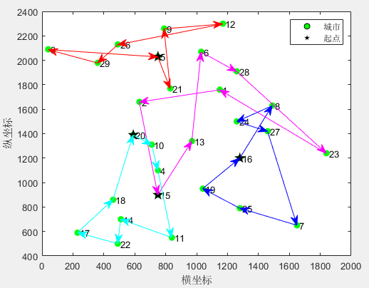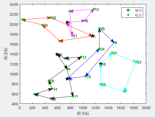 第1个旅行商的路径:5->21->9->12->26->29->3->5