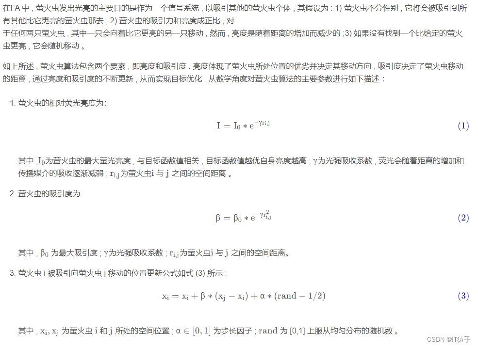 萤火虫算法(Firefly Algorithm,FA)是Yang等人于2009年提出的一种仿生优化算法。