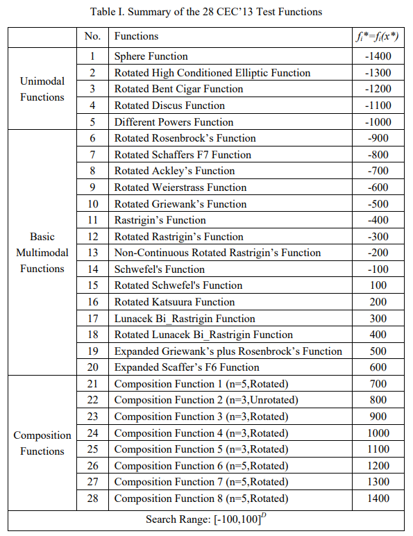 在CEC 2013 Special Session on Real-Parameter Optimization中共有28个测试函数,其维度可选择为10/30/50/100。每个测试函数的详细信息如下表所示: